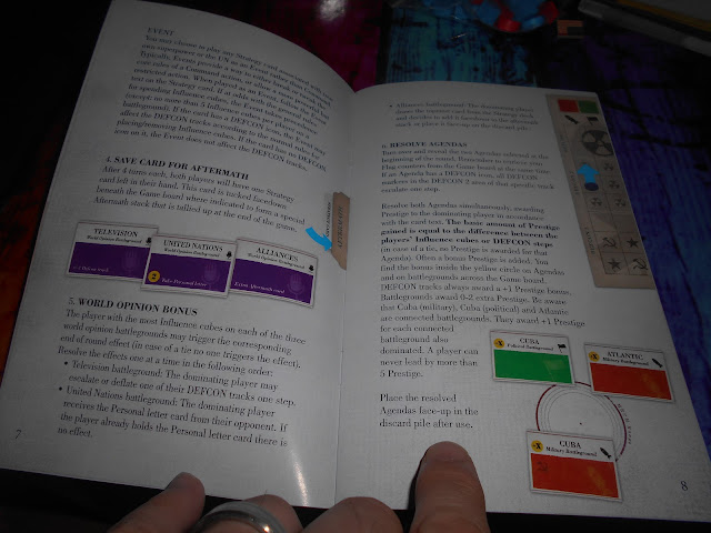 THis game does not take up much space as you can see, so is perfect for popping round a friends house for a "quick game" and in this case it honestly is a quick game, once you know what you are doing you can potential get through games in half an hour or less. The scoring track sliding means that its very difficult for you to be totally out of the game, as things can change with agendas, and early pushes that then become late game domination. It is only played over 3 rounds, but that doesn't feel like its not enough, it gives youa great feeling of dictating play, through the moving of your influence cubes. To me they had become different things, as i moved an Armour brigade into Berlin, or put out newspaper reports on how much i was doing to avoid war and its clearly the evil other guy who wants a fight, sending subs to the Atlantic, i felt IN the game, like i was looking at a map on the wall in my presidential office. I loved it, its a tough balancing act to keep pushing where you need to , and not over inflate the DEFCON track, but that really adds to the appeal of the game.